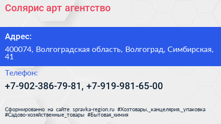 Солярис, арт-агентство по адресу 400074, Волгоградская область, Волгоград, Симбирская, 41 в дальнейшем Организация, размещена в следующих категориях: