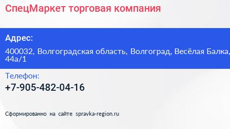 СпецМаркет, торговая компания по адресу 400032, Волгоградская область, Волгоград, Весёлая Балка, 44а/1 в дальнейшем Организация, размещена в следующих категориях: