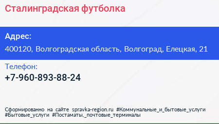 Сталинградская футболка по адресу 400120, Волгоградская область, Волгоград, Елецкая, 21 в дальнейшем Организация, размещена в следующих категориях: