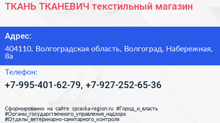 ТКАНЬ ТКАНЕВИЧ, текстильный магазин по адресу 404110, Волгоградская область, Волгоград, Набережная, 8а в дальнейшем Организация, размещена в следующих категориях: