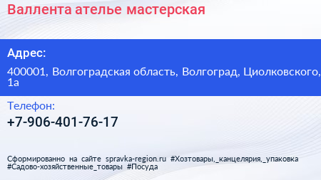 Валлента, ателье-мастерская по адресу 400001, Волгоградская область, Волгоград, Циолковского, 1а в дальнейшем Организация, размещена в следующих категориях: