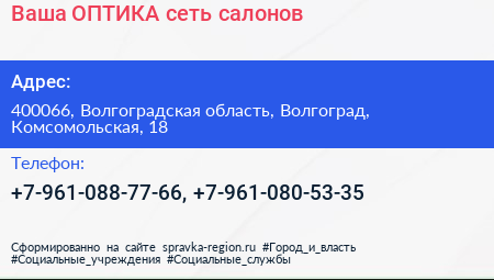 Ваша ОПТИКА, сеть салонов по адресу 400066, Волгоградская область, Волгоград, Комсомольская, 18 в дальнейшем Организация, размещена в следующих категориях: