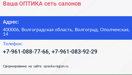 Ваша ОПТИКА, сеть салонов по адресу 400006, Волгоградская область, Волгоград, Ополченская, 14 в дальнейшем Организация, размещена в следующих категориях: