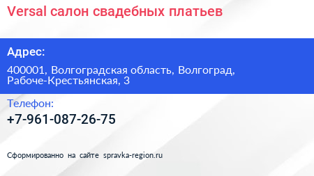Versal, салон свадебных платьев по адресу 400001, Волгоградская область, Волгоград, Рабоче-Крестьянская, 3 в дальнейшем Организация, размещена в следующих категориях: