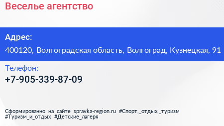 Веселье, агентство по адресу 400120, Волгоградская область, Волгоград, Кузнецкая, 91 в дальнейшем Организация, размещена в следующих категориях: