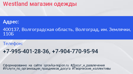 Westland, магазин одежды по адресу 400137, Волгоградская область, Волгоград, им. Землячки, 110Б в дальнейшем Организация, размещена в следующих категориях: