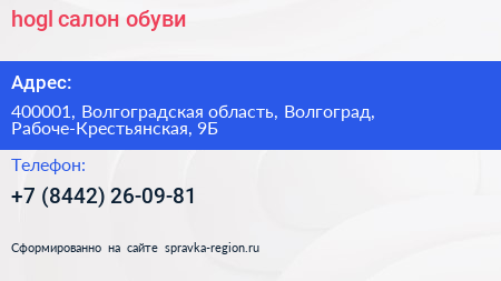 hogl, салон обуви по адресу 400001, Волгоградская область, Волгоград, Рабоче-Крестьянская, 9Б в дальнейшем Организация, размещена в следующих категориях: