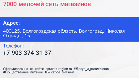 7000 мелочей, сеть магазинов по адресу 400125, Волгоградская область, Волгоград, Николая Отрады, 15 в дальнейшем Организация, размещена в следующих категориях:
