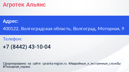 Агротек Альянс по адресу 400122, Волгоградская область, Волгоград, Моторная, 9 в дальнейшем Организация, размещена в следующих категориях:
