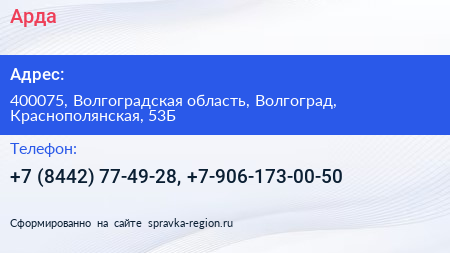 Арда по адресу 400075, Волгоградская область, Волгоград, Краснополянская, 53Б в дальнейшем Организация, размещена в следующих категориях: