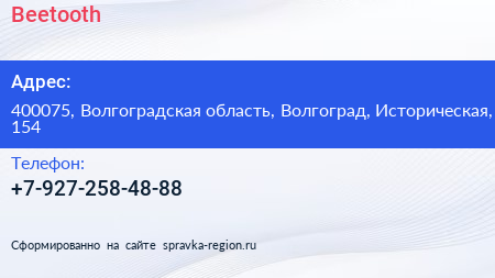 Beetooth по адресу 400075, Волгоградская область, Волгоград, Историческая, 154 в дальнейшем Организация, размещена в следующих категориях: