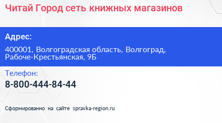 Читай-Город, сеть книжных магазинов по адресу 400001, Волгоградская область, Волгоград, Рабоче-Крестьянская, 9Б в дальнейшем Организация, размещена в следующих категориях: