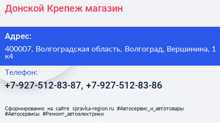 Донской Крепеж, магазин по адресу 400007, Волгоградская область, Волгоград, Вершинина, 1 к4 в дальнейшем Организация, размещена в следующих категориях: