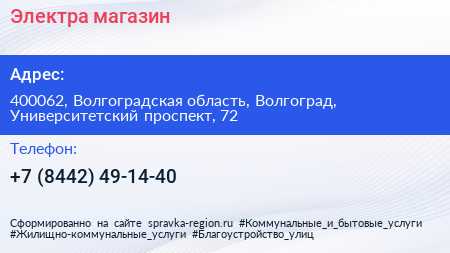 Электра, магазин по адресу 400062, Волгоградская область, Волгоград, Университетский проспект, 72 в дальнейшем Организация, размещена в следующих категориях: