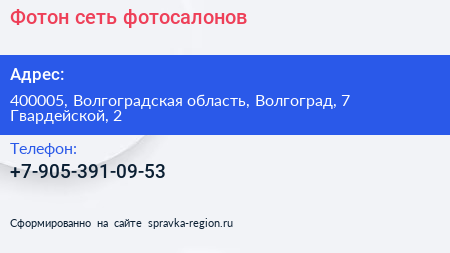 Фотон, сеть фотосалонов по адресу 400005, Волгоградская область, Волгоград, 7 Гвардейской, 2 в дальнейшем Организация, размещена в следующих категориях: