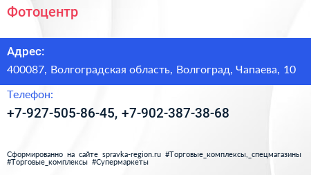 Фотоцентр по адресу 400087, Волгоградская область, Волгоград, Чапаева, 10 в дальнейшем Организация, размещена в следующих категориях: