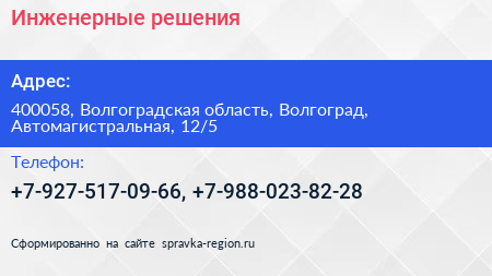 Инженерные решения по адресу 400058, Волгоградская область, Волгоград, Автомагистральная, 12/5 в дальнейшем Организация, размещена в следующих категориях:
