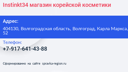 Instinkt34, магазин корейской косметики по адресу 404130, Волгоградская область, Волгоград, Карла Маркса, 52 в дальнейшем Организация, размещена в следующих категориях: