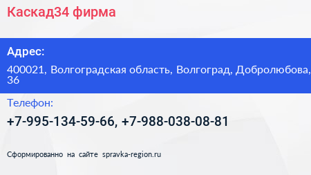 Каскад34, фирма по адресу 400021, Волгоградская область, Волгоград, Добролюбова, 36 в дальнейшем Организация, размещена в следующих категориях: