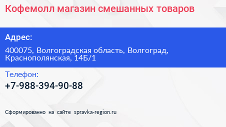 Кофемолл, магазин смешанных товаров по адресу 400075, Волгоградская область, Волгоград, Краснополянская, 14Б/1 в дальнейшем Организация, размещена в следующих категориях: