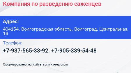 Компания по разведению саженцев по адресу 404154, Волгоградская область, Волгоград, Центральная, 18 в дальнейшем Организация, размещена в следующих категориях: