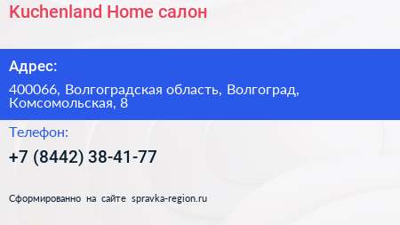 Kuchenland Home, салон по адресу 400066, Волгоградская область, Волгоград, Комсомольская, 8 в дальнейшем Организация, размещена в следующих категориях: