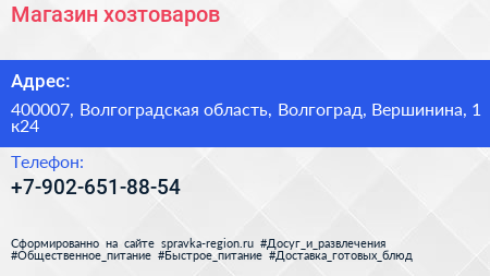 Магазин хозтоваров по адресу 400007, Волгоградская область, Волгоград, Вершинина, 1 к24 в дальнейшем Организация, размещена в следующих категориях: