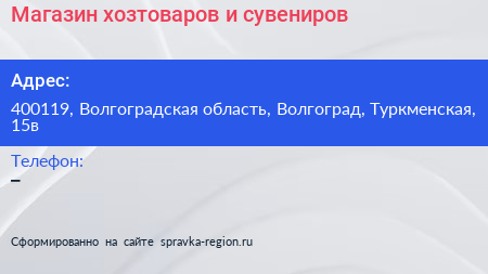 Магазин хозтоваров и сувениров по адресу 400119, Волгоградская область, Волгоград, Туркменская, 15в в дальнейшем Организация, размещена в следующих категориях: