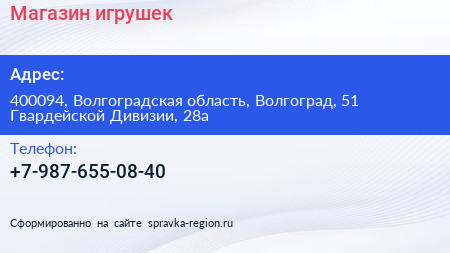 Магазин игрушек по адресу 400094, Волгоградская область, Волгоград, 51 Гвардейской Дивизии, 28а в дальнейшем Организация, размещена в следующих категориях: