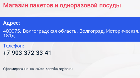 Магазин пакетов и одноразовой посуды по адресу 400075, Волгоградская область, Волгоград, Историческая, 181д в дальнейшем Организация, размещена в следующих категориях: