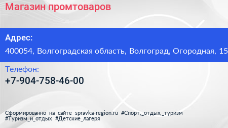 Магазин промтоваров по адресу 400054, Волгоградская область, Волгоград, Огородная, 15 в дальнейшем Организация, размещена в следующих категориях: