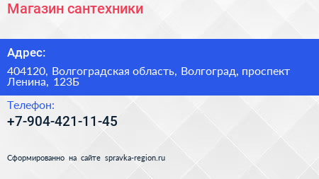 Магазин сантехники по адресу 404120, Волгоградская область, Волгоград, проспект Ленина, 123Б в дальнейшем Организация, размещена в следующих категориях: