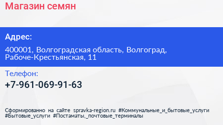 Магазин семян по адресу 400001, Волгоградская область, Волгоград, Рабоче-Крестьянская, 11 в дальнейшем Организация, размещена в следующих категориях: