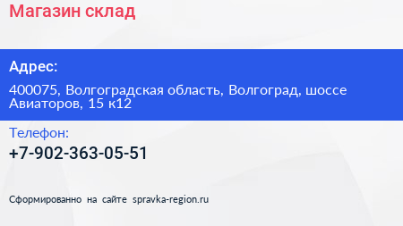 Магазин-склад по адресу 400075, Волгоградская область, Волгоград, шоссе Авиаторов, 15 к12 в дальнейшем Организация, размещена в следующих категориях: