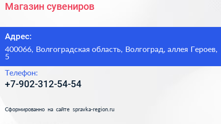 Магазин сувениров по адресу 400066, Волгоградская область, Волгоград, аллея Героев, 5 в дальнейшем Организация, размещена в следующих категориях: