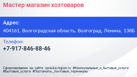 Мастер, магазин хозтоваров по адресу 404161, Волгоградская область, Волгоград, Ленина, 138Б в дальнейшем Организация, размещена в следующих категориях: