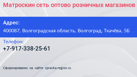 Матроскин, сеть оптово-розничных магазинов по адресу 400087, Волгоградская область, Волгоград, Ткачёва, 5Б в дальнейшем Организация, размещена в следующих категориях: