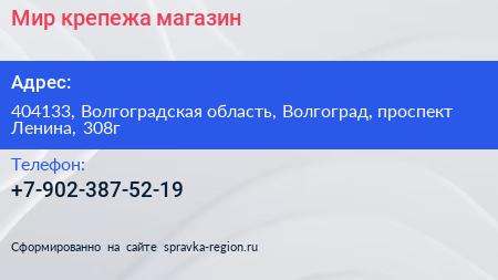 Мир крепежа, магазин по адресу 404133, Волгоградская область, Волгоград, проспект Ленина, 308г в дальнейшем Организация, размещена в следующих категориях: