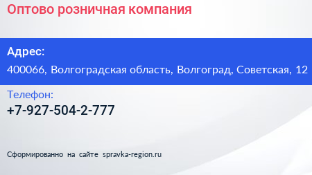 Оптово-розничная компания по адресу 400066, Волгоградская область, Волгоград, Советская, 12 в дальнейшем Организация, размещена в следующих категориях: