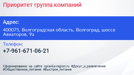 Приоритет, группа компаний по адресу 400075, Волгоградская область, Волгоград, шоссе Авиаторов, 9а в дальнейшем Организация, размещена в следующих категориях: