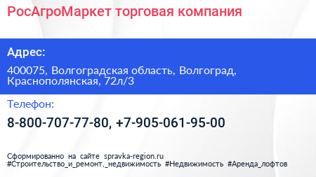 РосАгроМаркет, торговая компания по адресу 400075, Волгоградская область, Волгоград, Краснополянская, 72л/3 в дальнейшем Организация, размещена в следующих категориях: