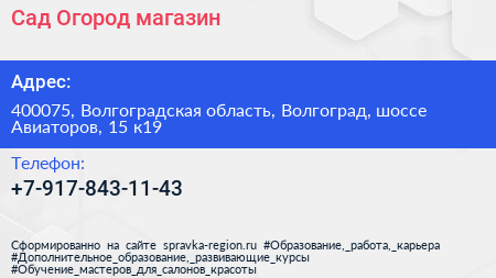 Сад Огород, магазин по адресу 400075, Волгоградская область, Волгоград, шоссе Авиаторов, 15 к19 в дальнейшем Организация, размещена в следующих категориях: