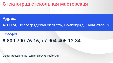 Стеклоград, стекольная мастерская по адресу 400094, Волгоградская область, Волгоград, Танкистов, 9 в дальнейшем Организация, размещена в следующих категориях: