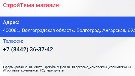 СтройТема, магазин по адресу 400081, Волгоградская область, Волгоград, Ангарская, 69а в дальнейшем Организация, размещена в следующих категориях: