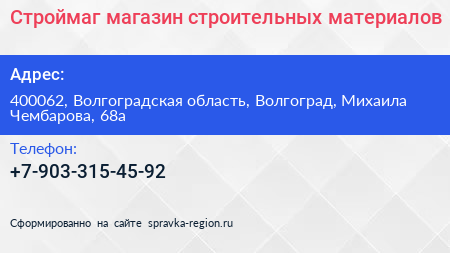 Строймаг, магазин строительных материалов по адресу 400062, Волгоградская область, Волгоград, Михаила Чембарова, 68а в дальнейшем Организация, размещена в следующих категориях: