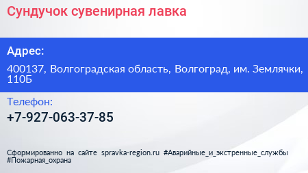 Сундучок, сувенирная лавка по адресу 400137, Волгоградская область, Волгоград, им. Землячки, 110Б в дальнейшем Организация, размещена в следующих категориях: