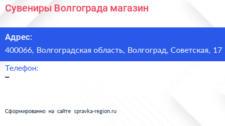 Сувениры Волгограда, магазин по адресу 400066, Волгоградская область, Волгоград, Советская, 17 в дальнейшем Организация, размещена в следующих категориях: