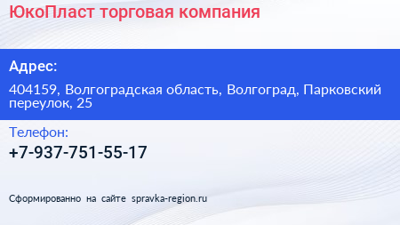 ЮкоПласт, торговая компания по адресу 404159, Волгоградская область, Волгоград, Парковский переулок, 25 в дальнейшем Организация, размещена в следующих категориях: