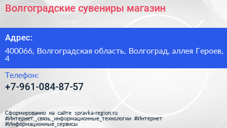 Волгоградские сувениры, магазин по адресу 400066, Волгоградская область, Волгоград, аллея Героев, 4 в дальнейшем Организация, размещена в следующих категориях: