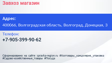 Завхоз, магазин по адресу 400066, Волгоградская область, Волгоград, Донецкая, 3 в дальнейшем Организация, размещена в следующих категориях: